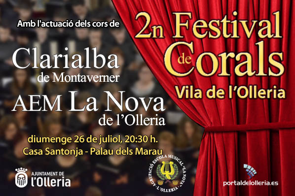 Diumenge que ve (26 de juliol), el Cor de l’Agrupació Escola Musical “La Nova” de l’Olleria organitza la segona edició Festival de Cors “Vila de l’Olleria” al pati de la Casa Santonja de l’Olleria a les 20:30 hores.