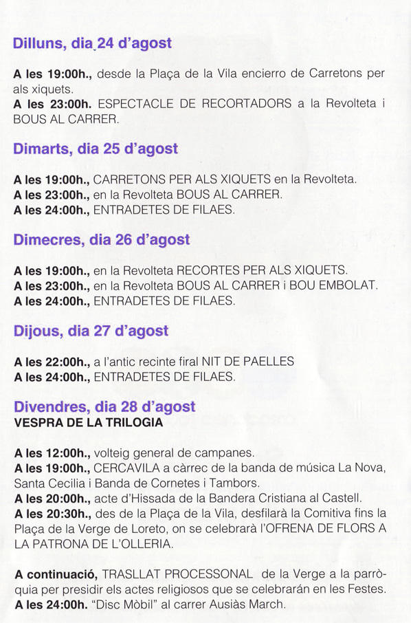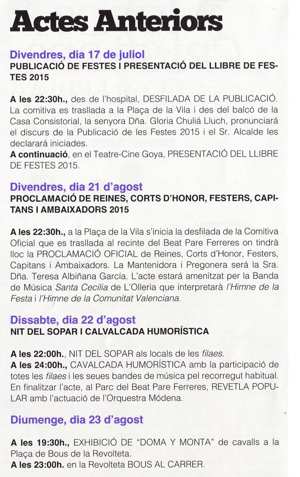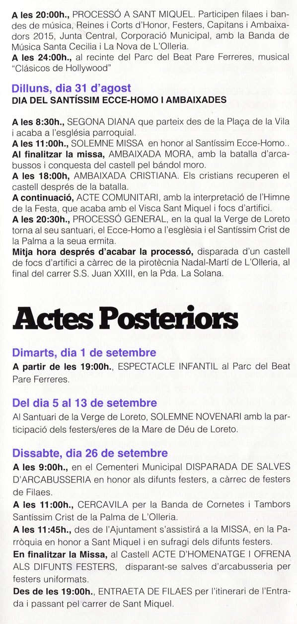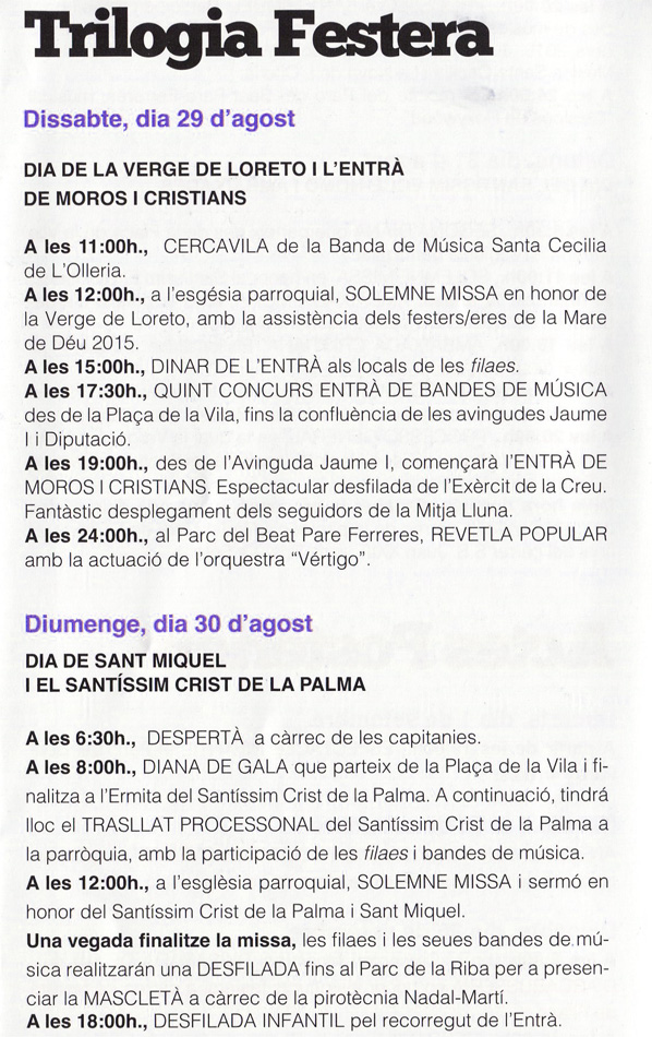 Programa completo de las Fiestas Patronales y de Moros y Cristianos de L’Olleria 2015.