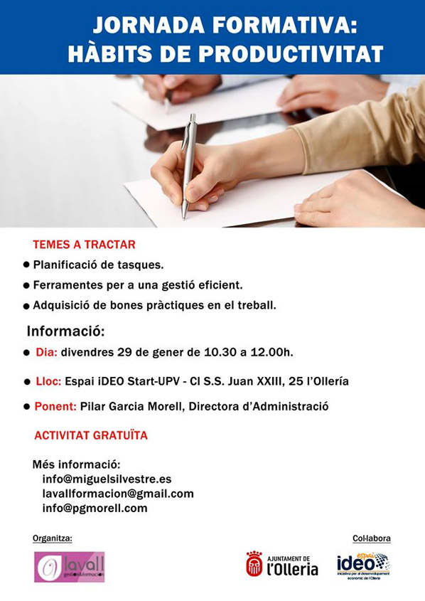 El divendres 29 de gener,de 10:30 h. fins les 12:00 h. en l’Espai Ideo-Start UPV (C/ S.S. Juan XXIII, nº25 baix), es celebrarà una jornada formativa gratuïta “HABITS DE PRODUCTIVITAT”.