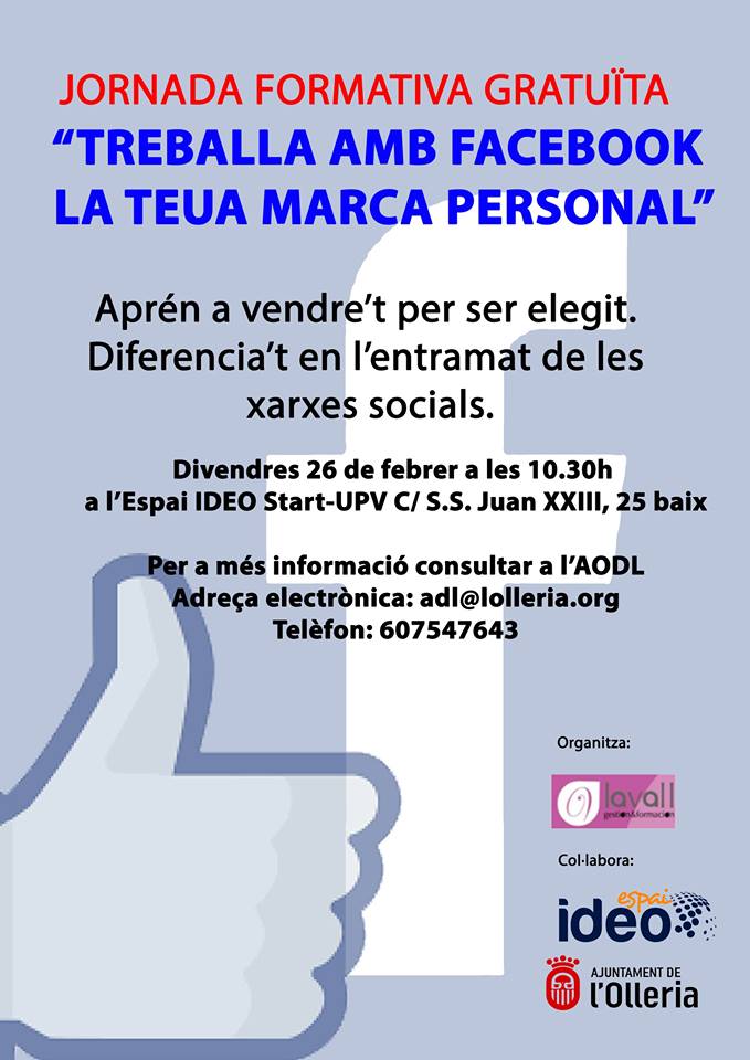 El divendres 26 de FEBRER, de 10:30 h. fins les 12:00 h. en l’Espai Ideo-Start UPV (C/ S.S. Juan XXIII, nº25 baix), es celebrarà una jornada formativa gratuïta “TREBALLA AMB FACEBOOK LA TEUA MARCA PERSONAL.