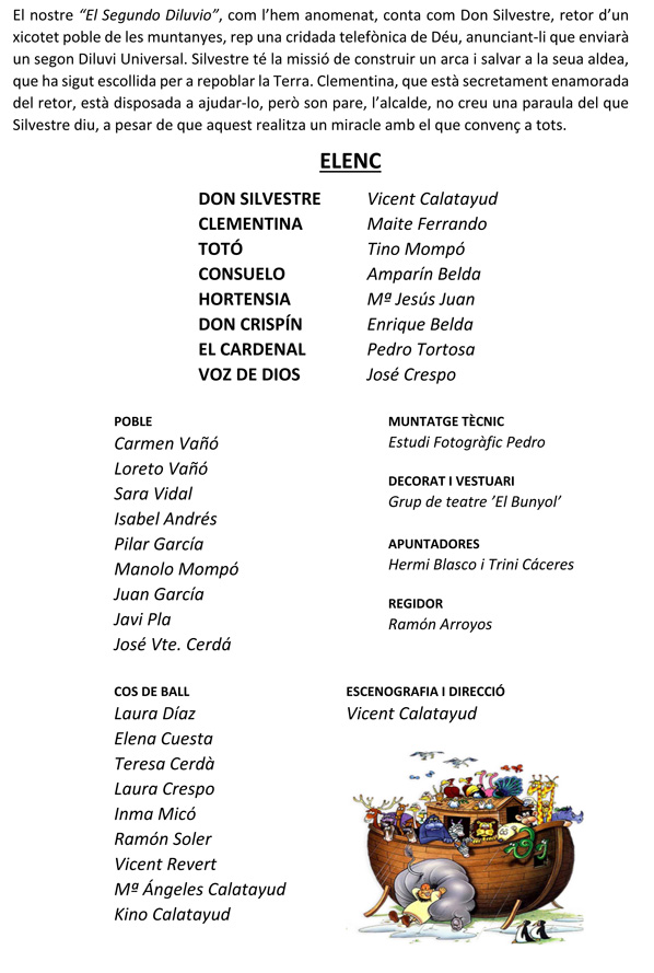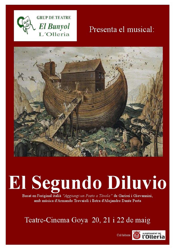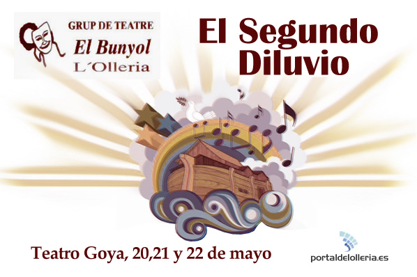 El próximo fin de semana, el Grup de Teatre El Bunyol, representará en el Teatro Goya, el musical “El segundo diluvio”, basado en la obra “aggiungi un posto a távola”, exitosa obra que triunfó en Roma a mediados de los 70 y que posteriormente fué traducida a varios idiomas. La función tendrá tres pases, el viernes, el sábado y el domingo. Escenografía y dirección Vicente Calatayud.