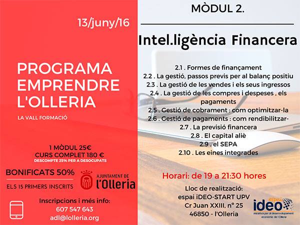 El dilluns 13 de juny es farà la segona de les sessions del Programa Emprendre l’Olleria, concretament la corresponent al modul Intel·ligència Financera. Una sessió en la qual s’abordaran diferents qüestions econòmiques importants per a tirar endavant el teu negoci amb èxit com: formes de finançament, com ha de ser la gestió de les vendes i les compres, així com altres cobraments i pagament, la previsió financera, el SEPA, etc.