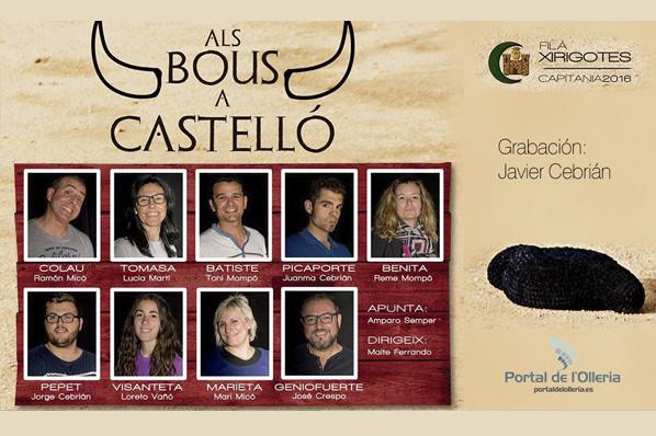 El primer fin de semana de Junio, la filá Xirigotes, estreno en el Teatro Goya, “Els bous a Castelló”, con motivo de su Capitanía (Mora) 2016, La obra se definía en tres conceptos: engaño, despiste y un picador poco profesional. La obra y la interpretación superó la expectativas, registrando el lleno en los tres pases durante el fin de semana.