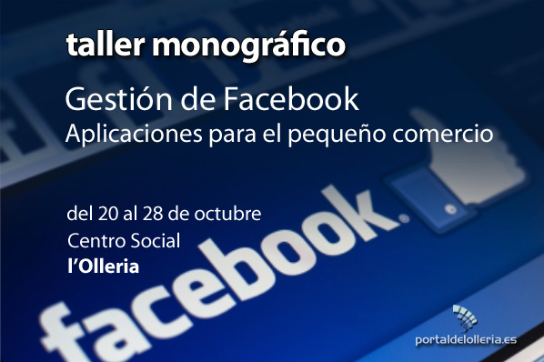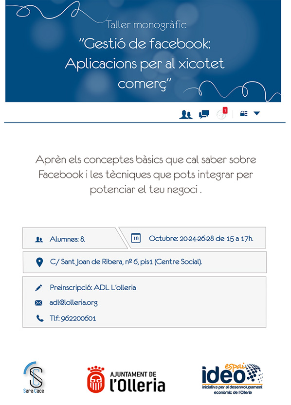 La regidoria de promoció econòmica ha llançat un curs de Facebook per a empreses. S’impartirà del 20 al 28 d’octubre. Per a inscriure’t en l’AODL(planta baixa Ajuntament), adl@lolleria.org o cridant al telèfon 607 547 643.