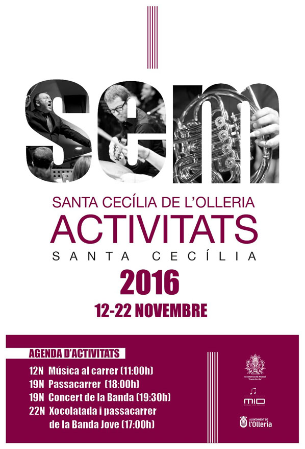 Dentro de las actividades programadas con motivo de la festividad de Santa Cecilia, la SEM Sta. Cecilia de l’Olleria, ofrecerá un pasacalles a partir de las 18:00 h, y posteriormente un concierto este sábado a partir de las 19:30 en el Teatro Goya.