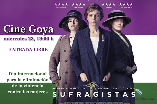 Dentro de las actividades programadas con motivo del “Día Internacional para la eliminación de la violencia contra las mujeres“, que se celebra el próximo viernes, este miércoles día 23 se hará la proyección de la película sufragistas. Será a partir de las 19:00 h h. en el Teatro Goya. entrada libre