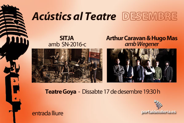 Este sábado, el teatro Goya, recibe una nueva sesión de “Acústics al Teatre”. En esta ocasión actuarán “Arthur Caravan & Hugo Mas amb Wegener” y “Sitja amb sn-2016-c”. Las actuaciones serán a partir de las 19:30 h. Entrada libre.