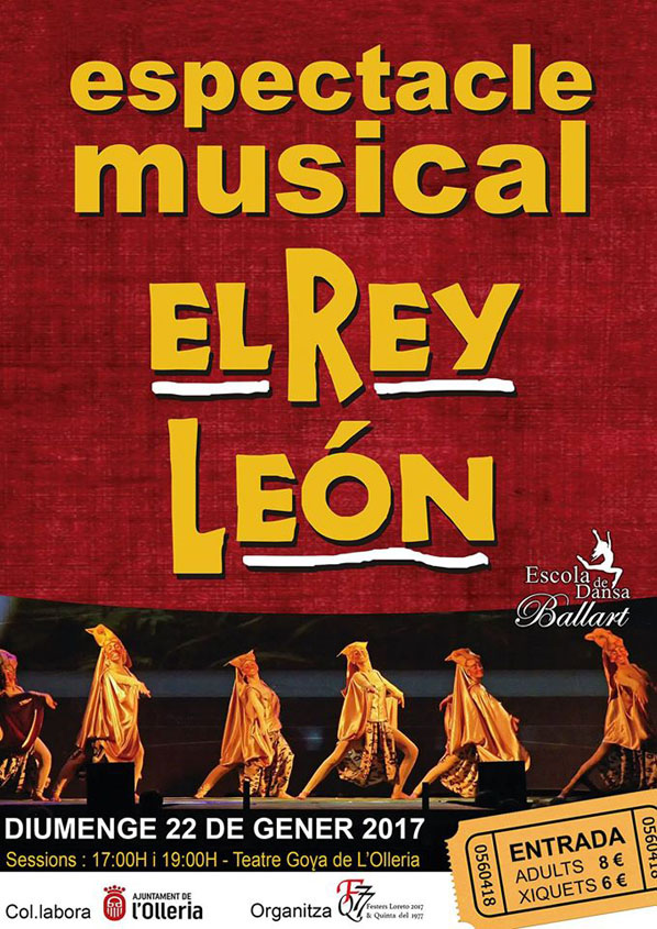 Organitzat pels Festers de Loreto del 2017 i la Quinta del 77, i la col·laboració de l’Ajuntament, aquest diumenge arriba al teatre Goya, l’adaptació musical del “El Rei Lleó”, a càrrec de la “Escola de Dansa Ballart” de Canals. Les entrades seran a 8 € per a adults i 6 € per a xiquets Tindrà dues funcions, la primera començarà a les 17:00 h, i la segona sessió a les 19:00 h.