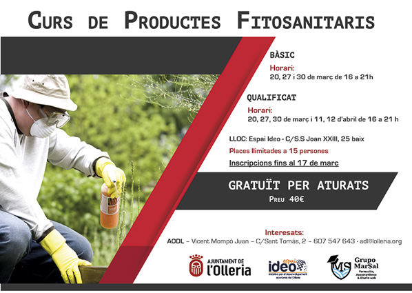 A finales de marzo se realizará un Curso de Productos Fitosanitarios, dividido en dos niveles, en l’Olleria. Concretamente el nivel básico se realizará los días 20, 27 y 30 de marzo de 16 a 21 horas y el avanzado los mismos días, más el 11 y 12 de abril, en el mismo horario.