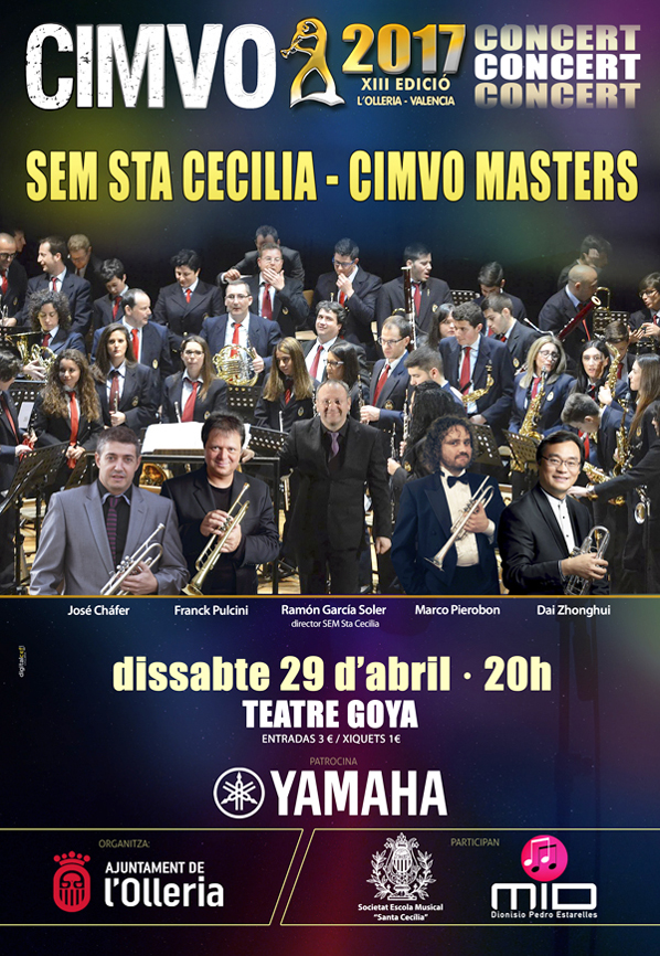 Para esta ocasión participarán el italiano Marco Pierobon (Profesor en el Conservatorio de Bolzano y miembro de Gomalan Brass Quintet) y Franck Pulcini (Profesor en el Conservatorio de Burdeos, Fundador de Epsilon Quartet y Solista de Orchestre de la Radio du Sud West Rundfunk de Baden-Baden / Freiburg), junto al Director Artístico del CIMVO y Profesor de la Cátedra de Trompeta del Conservatorio Superior de Murcia José Cháfer. La batuta del maestro Ramón García Soler, dirigirá a la SEM Sta Cecilia de l’Olleria.