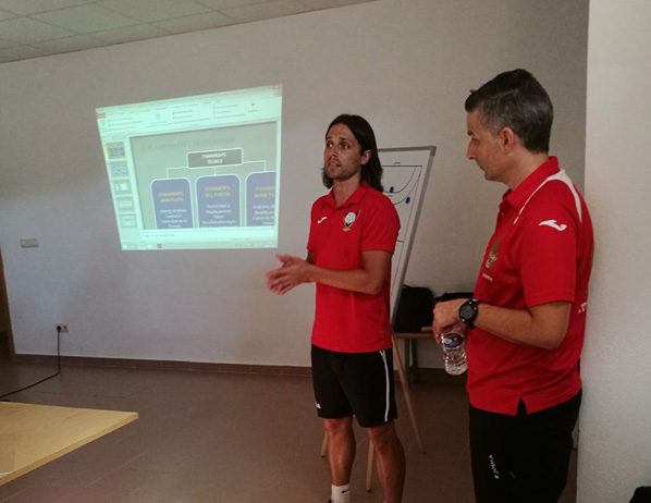Va començar a les 9:20h. del mati amb Braulio Correal ex entrenador del LLevant de primera divisió, va fer una explicació amb videos de com es te que començar a treballar un equip per aconseguir el maxim rendiment per a despres poder jugar al joc de 4 en defensa com en atac, despres varem passar al camp de joc on en col.laboració dels cadets i juvenils de l´escola va ficar en martxa tot allo que va explicar a l´aula. Sense dubte uns dels millor entrenadors del nostre pais, un luxe contar amb ell.
