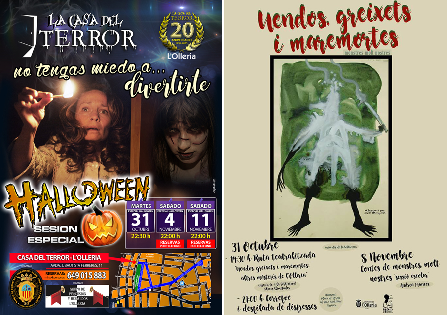 Com és habitual en els últims anys l’Olleria està “abonada” a celebrar la nit de “Halloween” en diferents formats. Al més pur estil zoombie, i una altra variant més “tradicional” de rutes teatralitzades. El cas és que aquest festeig avantsala del dia de “Tots Sants”, cada vegada té més adeptes (i alguns detractors). Per a aquest 31 d’octubre la celebració comença a les 19:30 h amb una ruta teatralitzada “uendos, greixets i maremortes” per assistir-hi cal inscriure a la Biblioteca, que serà des d’on s’iniciï el recorregut. A les 21:00 h, el punt de concentració serà a la Plaça de la Mare de Déu de Loreto, la desfilada de disfresses que es dirigirà al Parc Beat Pare Ferreres on es celebrarà el “correfoc”. A les 22:30 h la Casa del Terror començarà la seva sessió especial de “Halloween”.