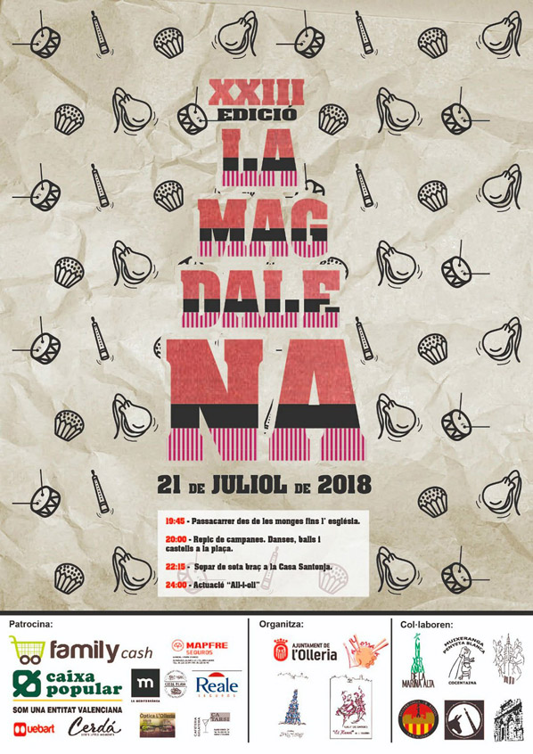 El sábado 21 de julio, l’Olleria celebra la fiesta de la Magdalena. Fiesta en la que predominan detalles tradicionales de la cultura local, “danses, dolçainers, y muixeranges” para los más adeptos al folclore valenciano. Este año, que cumple su edición XXIII, los actos comenzaran a las 19:45 h, con un pasacalles desde el antiguo hospital de las monjas, hasta la parroquia Santa Mª Magdalena, donde tendrán lugar las primeras danzas, y castillos humanos, que proseguiran en la plaza de la Vila.