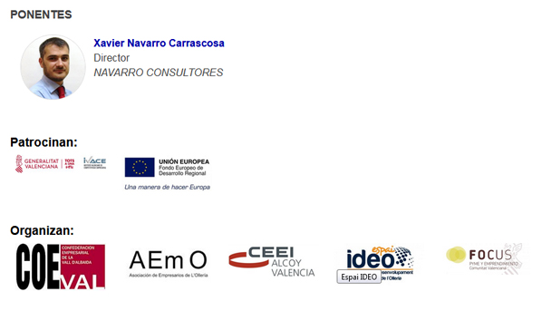 Esta jornada se enmarca en Focus Pyme y Emprendimiento, iniciativa promovida y financiada en años anteriores por la Generalitat Valenciana, a través del Instituto Valenciano de Competitividad Empresarial (IVACE), dentro de su política de apoyo al emprendimiento y la pyme, y ha contado con la cofinanciación de los fondos FEDER de la Unión Europea, dentro del Programa Operativo FEDER de la Comunitat Valenciana 2014-2020. Este año está previsto solicitar la financiación del IVACE-Generalitat Valenciana y FEDER-Unión Europea.