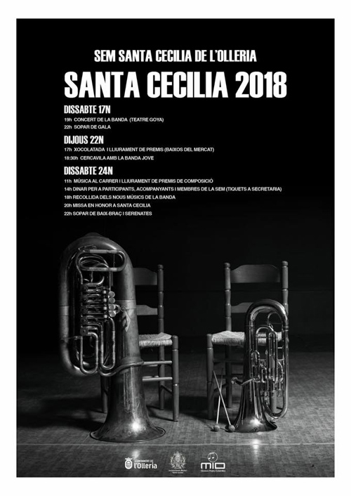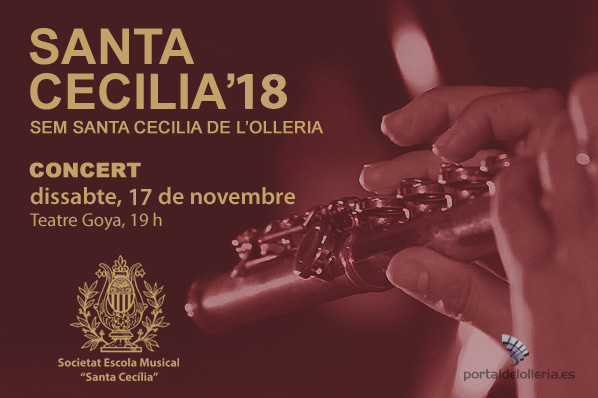 La SEM Sta Cecília de l’Olleria celebra la festivitat de Sta. Cecília amb diversos actes, que tindran el seu punt de partida el proper dissabte, 17 de novembre, amb el Concert de la Banda al Teatre Goya, a partir de les 19: 00 h. A partir de les 22h, gaudiran d’un “sopar de gala”.