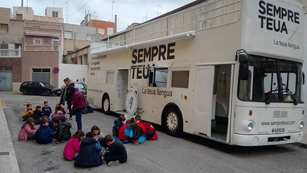 El “Bus la Llengua” és una iniciativa finançada pel Govern valencià amb 2,3 milions d’euros, que va recorrent diverses ciutats de la Comunitat Valenciana i impartint sessions a les escoles.