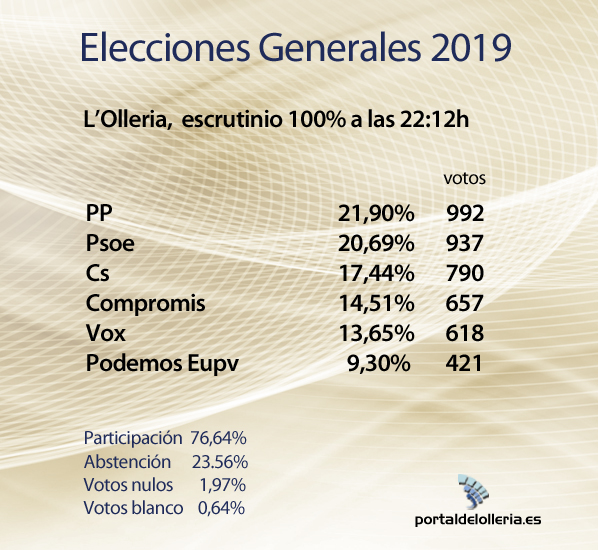 La participación de los ollerienses en la Elecciones Generales, se saldó con 76,64% de participación. Los votos en clave nacional muestran un resultado parejo entre los dos primeros partidos del pais, el PP aventajó a los Socialistas en 55 votos.