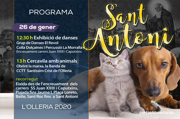 El acto del Pasacalle con animales, por motivo de las Fiestas de San Antonio de l’Olleria 2020, tendrá lugar el domingo 26 de enero. Concretamente a las 12:30 horas se realizará una exhibición de danzas de la mano del Grupo de Danzas El Revol y la Colla de dolçainers de l’Olleria en el cruce de las calles Juan XXIII y Caputxins, seguido a las 13 horas de un pasacalle con animales con la colaboración de la Banda CCTT Santísimo Cristo de l’Olleria.