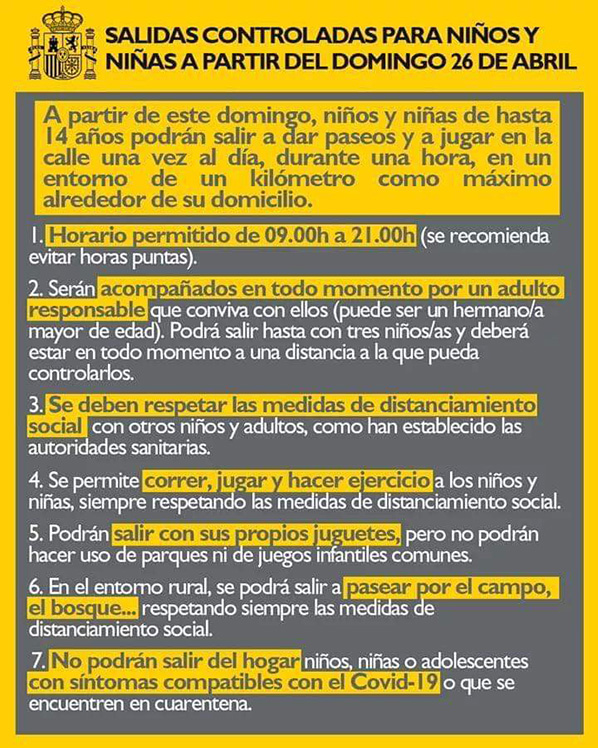 A partir de este domingo, 1.187 ollerienses (el 14% de la población), menores de 14 años, podrán salir a la calle a “estirar” las piernas. Las condiciones del gobierno a día de hoy son que dicha actividad será de un máximo de 1 hora, entre las 9 de la mañana y las 21 h de la noche. Deberán estar acompañado por un adulto, que se encargará de controlarlos y de que respeten el distanciamiento social y todas las normas vigentes en lo que respecta a higiéne. El número máximo de niños que pueden acompañar al adulto es de tres.