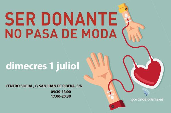 El proper dimecres 1 de juliol, la unitat mòbil del “Centre de Transfusió” de la Generalitat Valenciana es traslladarà a l’Olleria. La donacions es podran realitzar al Centre Social del carrer Sant Joan de Ribera, de 9:00 a 13:00 h i de 17:00 a 20:30 h.