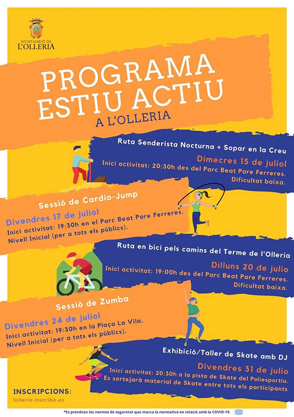 Des de la Regidoria d’Esports de l’Ajuntament de L’Olleria llancem el programa gratuït ESTIU ACTIU A L’OLLERIA enfocat a tota la població (els menors de 12 anys hauran d’anar acompanyats d’un adult) i amb la finalitat de fomentar la pràctica esportiva a l’aire lliure.