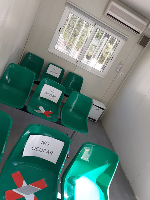 Esta sala anexa instalada en la misma entrada del Hospital cuenta con ventilación, calefacción y aire acondicionado así como sillas y elementos de seguridad como gel hidroalcohólico e información de servicio.