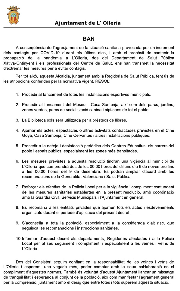 Desde el Consistorio seguimos confiando en la responsabilidad de las vecinas y vecinos de L’Olleria y esperamos, una vez más, poder contar con su colaboración en el cumplimiento de estas normas. También es voluntad de este Ayuntamiento lanzar un mensaje de tranquilidad y esperanza al conjunto de la población, así como manifestar el agradecimiento general por la comprensión, junto con el deseo que entre todas y todos superemos esta situación.