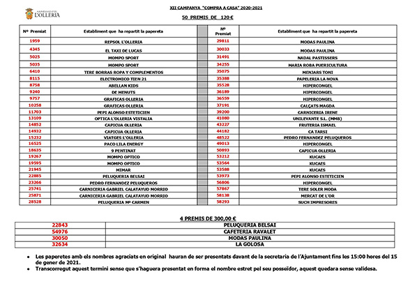 Listado de números premiados de la campaña “Compra a casa” de L’Olleria