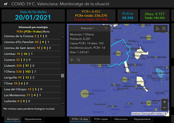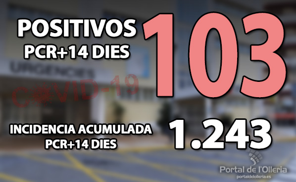 Desde ayer según fuentes de la Conselleria de Sanitat, tenemos 103 contagiados y una incidencia acumulada de 1.243 afectados por cada 100.000 hab. (pcr+14dies). Y según los registros de Sanitat, debemos lamentar un fallecimiento más.