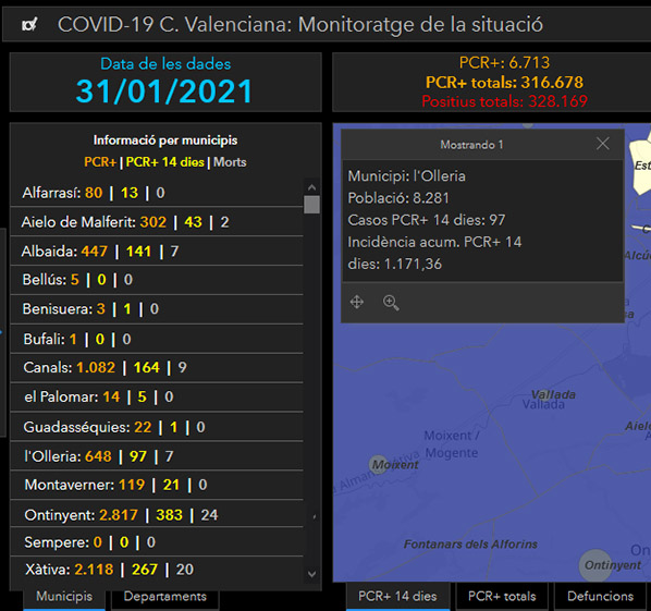 Desciende de forma significativa el número de contagios en l’Olleria. 39 positivos menos desde la última actualización de la Generalitat, que también repercute en la incidencia acumulada rebajándola a 1.171 hab. Las cifras siguen siendo altas y preocupantes, la única nota “positiva” es que se ha frenado la vertiginosa línea ascendente que llevabamos durante todo el mes de enero y que parecía no tener techo. Pero este dato (esperanzador), no oculta la realidad que seguimos viviendo. El resto de poblaciones próximas a l’Olleria, también registran descensos importantes, salvo El Palomar el resto de municipios ven como sus curvas de contagio se han frenado.