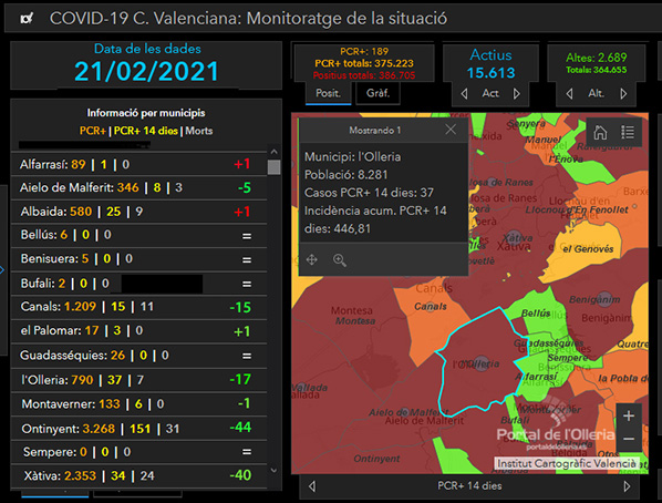 L’Olleria registra en la última actualización de datos otro descenso que sitúa el número de contagios en 37, con una incidencia acumulada (pcr+14d) de 446,81, que es una de las cifras más altas de la zona, superior a Ontinyent, Albaida ó Xátiva. Aún asi todo lo que sea reducir la curva de contagios siempre es buena noticia. La tendencia es generalizada en los municipios limitrofes y las dos grandes urbes donde destaca Xàtiva que coloca su nivel de incidencia en 116. Los únicos que suman afectados son Alfarrasí que vuelve a tener uno, y Albaida que también suma otro en su balance, tras una importante reducción en la semana anterior. La única excepción en toda la zona la marca Benigànim con una incidencia que supera los 1215 positivos/100.000 hab. y que sigue siendo una de las zonas más afectadas desde hace mucho tiempo.