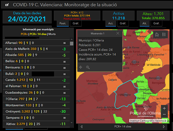 Dentro de la desescalada generalizada que está viviendo toda la Comunitat Valenciana, l’Olleria rebaja su número de positivos a 24, con una incidencia acumulada (pcr+14) de 289,92. Sigue siendo una zona roja al igual que Albaida y Ontinyent, si bien el descenso desde el 29 de enero es significativo (136 con una incidencia de 1600). En los que respecta a los municipios próximos, se mantienen ó descienden el número de positivos como sucede en Montaverner, Canals ó Aielo. Por su parte Ontinyent continúa con desescalada y significativa es la Xàtiva que ha rebajado su nivel de incidencia a 72 e incluso el número de positivos es menor que el de l’Olleria.