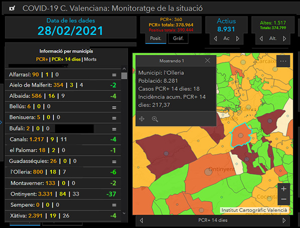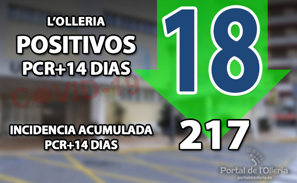 Continùa la desescalada de contagios en l’Olleria, que abandona la zona roja de riesgo, pero se mantiene en naranja debido a que todavía mantiene una alta incidencia acumulada (+14d) situada ahora en 217. y 18 contagios activos, 6 menos que el último recuento del 24 de febrero. Es la tendencia en toda la zona, si bien l’Olleria desciende a menor ritmo. Alfarrasí se sitúa en 1 contagiado y 3 Aielo de Malferit son unos registros más que aceptables, Albaida uno de los municipios más castigados ha bajado hasta 16 positivos. Canals baja a 9, y muy destacado es el descenso en Xàtiva que ya han bajado a 19 y deja su nivel de riesgo en 65. Muy lejos de Ontinyent con 84 positivos y una incidencia de 271. De toda la zona próxima a l’Olleria, sólo se mantienen en nivel rojo, Albaida y el Palomar, que pese a tener 2 positivos, para una población de 590 ofrece una incidencia del 338.