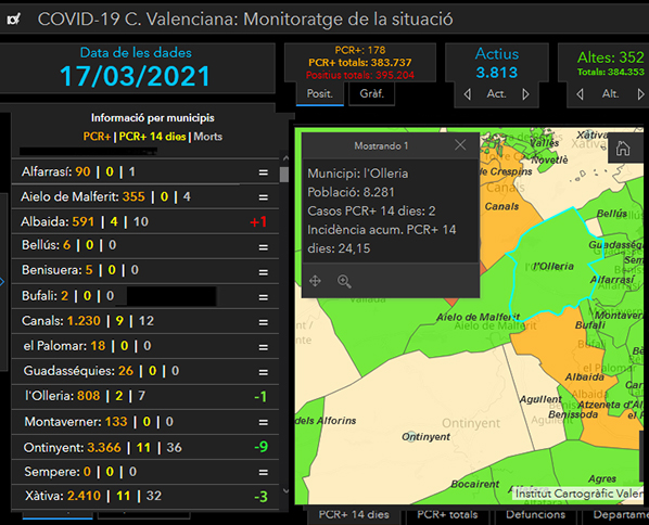 Tras una pequeña oscilación el pasado martes, l’Olleria vuelve a senda de la desescalada rebajando en una unidad el número de contagiados hasta establecerla en dos (2). La incidencia acumulada pcr+14 dias se sitúa en 24, 15. El resto de poblaciones limitrofes o bien se mantienen en cero casos (las más pequeñas) ó siguen descontando. Las únicas excepciones las ofrece Albaida que sube uno y Canals que no varía de los 9 contagiados. Ontinyente vuelve a bajar otros 9 positivos y ya iguala a Xátiva que desciende otros tres.