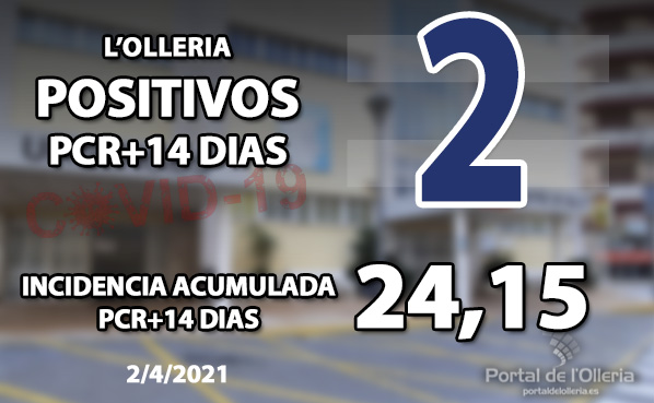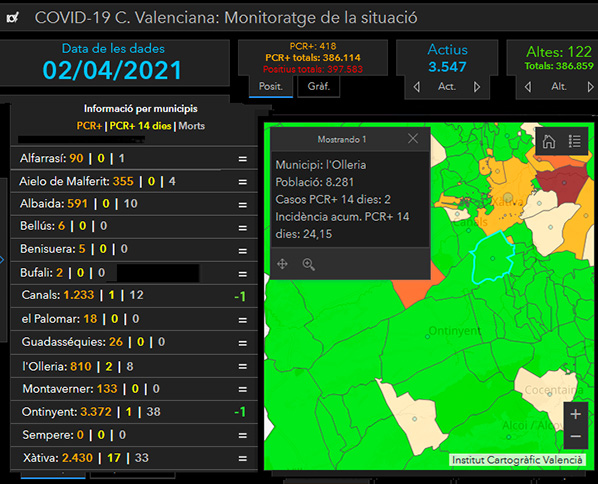 El número de afectos por coronavirus en l’Olleria no ha variado en toda la semana, y permanece en dos casos, lo que permite a la localidad seguir con le etiqueta de zona de bajo riesgo. Canals y Ontinyent ya registran menos casos que l’Olleria, ofreciendo un caso por municipio en sus registros. Xàtiva mantiene sus 17 casos sin alteración. y el resto de municipios de la zona continúan sin positivos en sus cifras. La única nota discordante en toda la Vall d’Albaida, la encontramos al noreste (Benigànim 3, Quatretonda 2, Llutxent 1), pero con registros muy parejos al resto de municipios que conforman “la Vall”.