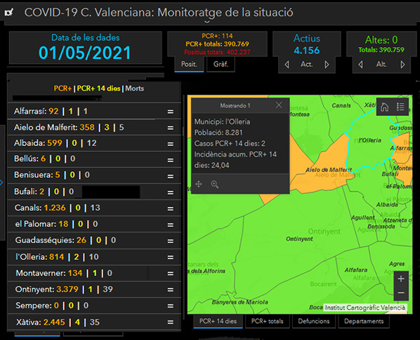 Según los datos de monitorización de la Generalitat Valenciana, l’Olleria y localidades próximas no registran ninguna variación en sus datos del martes respecto al viernes anterior. L’Olleria continúa con 2 afectados, Aielo de Malferit sigue con 3, Montaverner y Alfarrasí siguen con uno y las grandes poblaciones como Xátiva y Ontinyent 4 y 1 respectivamente. Tal como está la situación en otros puntos del pais, son datos bastante tranquilizadores que invitan a mantener las medidas de prevención para alargarla todo lo posible.