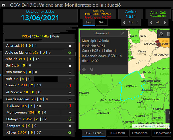 L’Olleria vuelve a sumar un contagio después de casi un mes sin incidencias. El resto de municipios limitrofes Canals también suma un caso acumulando 2, mientras Aielo de Malferit reduce su cuenta a “cero”. No hay novedades en el resto de la “vecindad”, salvo Xátiva que vuelve a descontar en este caso 2, para situar el número de afectados en 8, mientras Ontinyent también reduce dos casos para establecerse en 6.