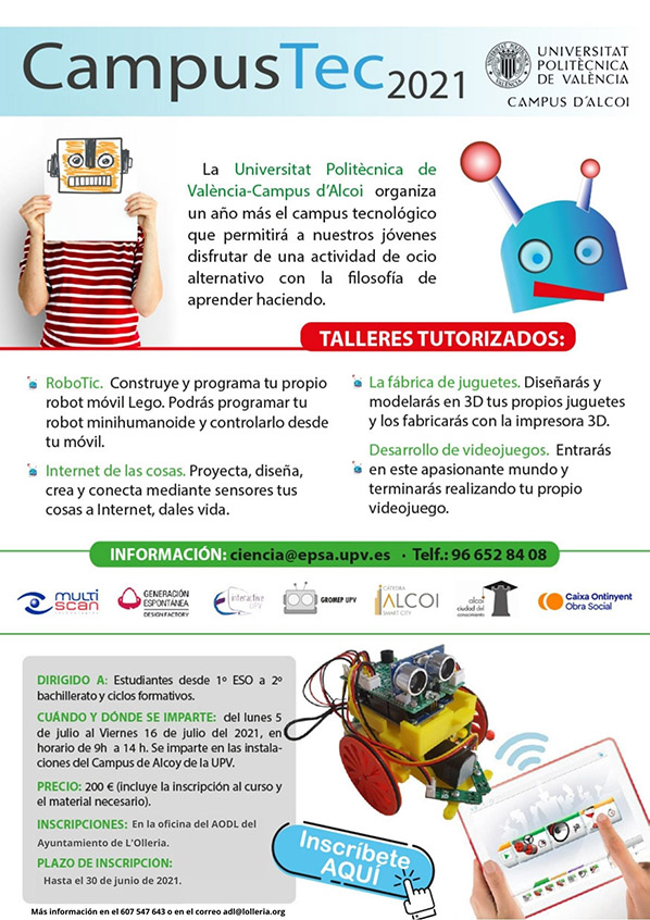 Un año más, el Ayuntamiento de L’Olleria becará a 3 estudiantes de entre 1º de ESO hasta Bachillerato y Ciclos Formativos, para poder participar en el campus tecnológico, CAMPUSTEC, de la Universitat Politècnica de València en su Campus de Alcoy.