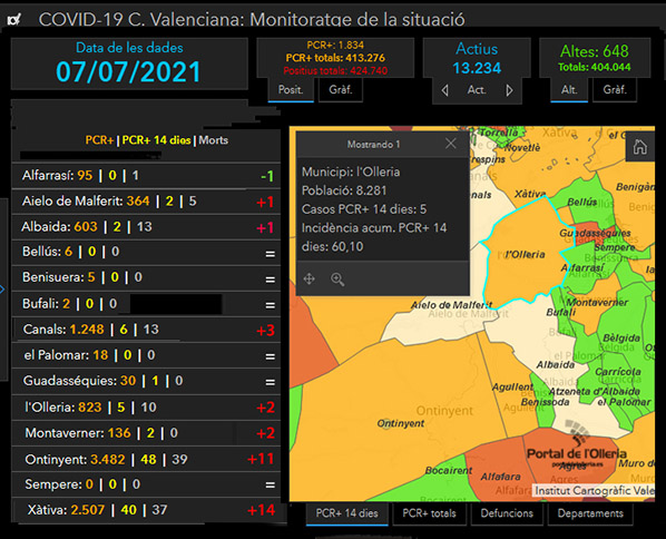 El mapa de contagios se está complicando en l’Olleria y alrededores, pero especialmente en Ontinyent y Xàtiva, que son el referente de como se encuentra la situación en la zona. Los de La Costera, de estar “coqueteando” con los cero contagios hace tan sólo diez dias, alcanzan ahora los 40 afectados. Por su parte Ontinyent en situación similar sube a los 48 contagios. (El 24 de junio, Ontinyent tenía 2 y Xátiva 0). L’Olleria por su parte sube a 5 casos, no se recuerdan tantos desde los primeros dias de marzo. Montaverner, Aielo, Albaida, Canals también sufren un aumento de afectados en esta semana. Tan sólo Alfarrasí ofrece un descenso, volviendo a recuperar su condición de “cero” afectados.