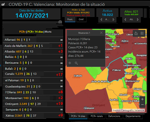 La quinta ola es un hecho, y el mapa de incidencias en la Comunitat Valenciana, vuelve a oscurecerse lentamente. L’Olleria alcanza los 23 contagios a fecha 14 de julio, con una incidencia de 276 puntos que invitan a extremar las precauciones.
