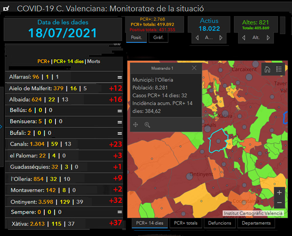 L’Olleria alcanza los 32, Aielo de Malferit sube a 16, Albaida a 22 y Canals en los 59. Todas estas poblaciones unidas a Ontinyent (129) ó Xàtiva (115), ronda una incidencia que oscila entre los 350 y los 400. Pero si nos vamos a otras pequeñas poblaciones, Montaverner 8, Guadassequies 3, el Palomar 4, su incidencia se mueve entre los 490 y los 700 casos confirmados en los últimos 14 dias por cada 100.000 habitantes.