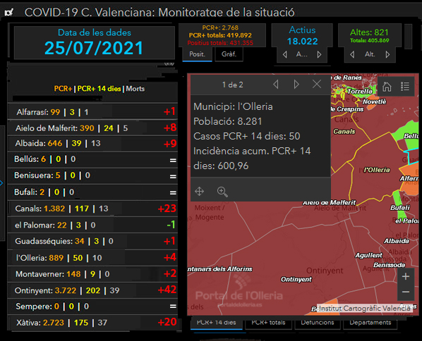 L’Olleria acumula a 25 de julio 50 afectados por Covid19, pero a un ritmo menor del que estaba se estaba registrando durante toda la semana (+4), un día antes de la restricción de movilidad nocturna decretada por la Generalitat. Esta tendencia se está repitiendo en la mayoría de municipios limitrofes, si bien algunos registran cifras severas, se aprecia un ascenso menos vertiginoso. Canals mantiene una alta tendencia a acumular casos y Aielo de Malferit y Albaida tiene una importante cifra de afectados al igual que Ontinyent que ahora mismo ya supera los 200 casos.