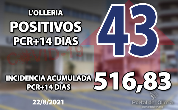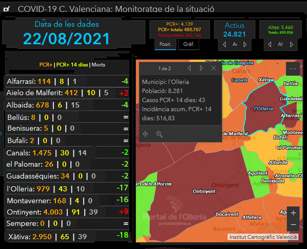 Covid19, L’Olleria “alivia” la presión con un importante descenso de positivos. 17 casos menos desde la última “lectura” de la Generalitat, que sitúa a 22 de agosto en 43 casos activos. La cifra sigue siendo alta, pero al menos se rompe la tendencia de crecimiento que practicamente se estaba acumulando durante el mes de agosto.