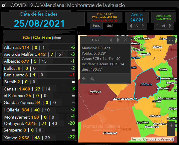 Descenso generalizado de nuevos casos Covid, en l’Olleria y su entorno. Si bien en l’Olleria mantiene un alto número de afectados, tras deducir 3 casos para situarse en 40. En su entorno, Alfarrasí, Bellús y Montaverner vuelven a poner a cero sus registros y Aielo de Malferit se sitúa en 7. Las grandes poblaciones siguen rebajando por decenas sus casos, Ontinyent -20 y Xàtiva -22. Es la tónica general que inusualmente rompe Benisuera, población acostumbrada a estar permanentemente en cero, en esta ocasión suma 1 caso. Ese sólo caso con una población de 197 personas, hace que su tasa de incidencia sea de 540, la más alta de toda la zona reseñada.