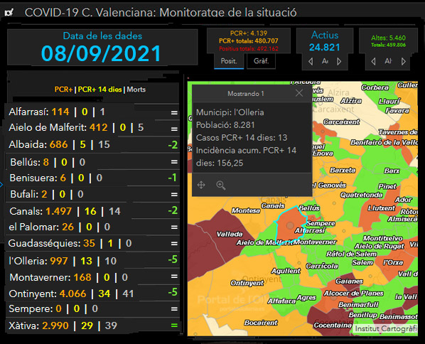 Continúa la desescalada en l’Olleria y poblaciones vecinas. L’Olleria desciende a los 13 contagios activos en los últimos 14 días. Esta tendencia es similar al resto de municipios de la zona, que o bien ya estan situados en los “cero” afectados ó siguen con la misma línea descendente. Tal y como informan las autoridades sanitarias, el virus sigue ahi, es decir aunque ahora las cifras empiecen a ser propicias, no hay que descuidar las normas de prevención e intentan alejar lo más posible la próxima ola.