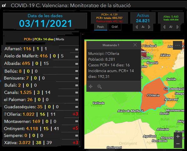 L’Olleria sigue sumando casos Covid y ya alcanza los 16 casos activos con una incidencia de 192,31. Mientras Ontinyent y Xátiva también suman otros tres casos a sus registros, si bien los setabenses acumulan 38 casos esta vez de forma moderada (+3), frente a los 15 de la mayor población de la Vall d’Albaida.