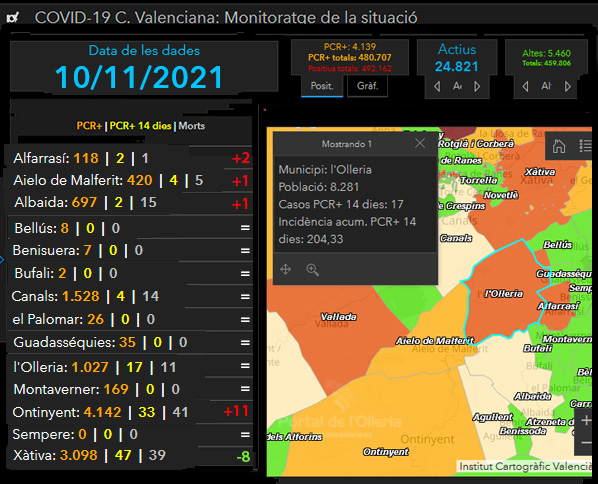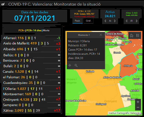 L’Olleria mantiene los 17 casos positivos que ya mostraba desde el día 7 de noviembre con una incidencia alta (204,33), a la espera de que en los próximos días pueda reducirse el registro. Desde esa misma fecha Alfarrasí, Aielo de Malferit y Albaida van sumando casos aunque de forma moderada. Por su parte Ontinyent aumenta su número a 33 tras los últimos 11 casos nuevos, mientras Xàtiva tras una escalada preocupante, frena y reduce en 8 el número de afectados, situándose en 47.