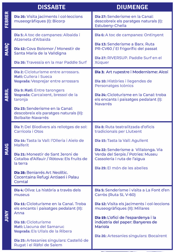 En la resta de rutes organitzades a les comarques veïnes, podrem descobrir la vida dels neandertals a la Cova de Bolomor o l’edat mitjana al Monestir de Santa Maria de la Valldigna, l’època del modernisme a Alcoi, així com altres propostes de turisme actiu com una ruta guiada pel riu Xúquer, cicloturisme en els arrossars de Cullera, paddle surf, senderisme per diversos paratges o bird-watching, conegut com a albirament d’aus, i molt més.