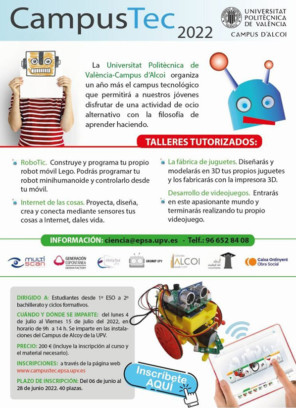La Universitat Politècnica de València. Campus d’Alcoi, organitza un any més el CAMPUSTEC. És un campament tecnològic d’estiu que permetrà als nostres joves gaudir d’una activitat d’oci alternatiu durant les vacances d’estiu, amb la filosofia d’aprendre fent, des del dilluns 4 de juliol al divendres 15 de juliol de 2022, en horari de 9.00 a 14:00h. Al llarg de dues setmanes, els participants donaran curs a la seua creativitat desenvolupant xicotets projectes cientificotècnics en àmbits tan atractius per al seu futur professional com la robòtica, el disseny i fabricació digital, la programació d’interfícies, i desenvolupament de videojocs.