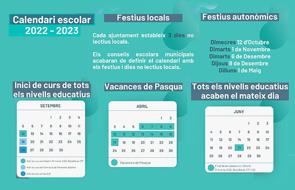 S’ha publicat el calendari escolar per al curs 2022-2023. En les imatges següents està detallada la informació de les dates més destacables del curs. Així i tot, falta concretar els dies no lectius que el Consell escolar municipal triarà en la seua pròxima sessió. Una vegada s’hagen triat aquests dies no lectius locals, us enviarem abans de l’inici del pròxim curs el calendari amb el format que normalment compartim cada any.